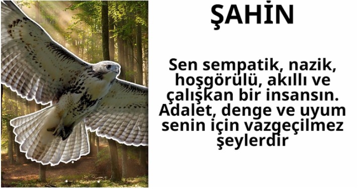 EYLÜL Senin doğum kuşun “şahin” Sen sempatik, nazik, hoşgörülü, akıllı ve çalışkan bir insansın. Adalet, denge ve uyum senin için vazgeçilmez şeylerdir. Çoğu zaman duygularını ve mantığını dengelersin. İnsanların vakit geçirmeyi sevdiği bir insansın ve her zaman çevrene neşe saçarsın. Haksızlığa uğramak ve haksızlık yapmak en nefret ettiğin şeyler arasında. Her zaman güzellik için çabalayan bir bireysin. Şimdi sonucunu arkadaşlarınla paylaş!