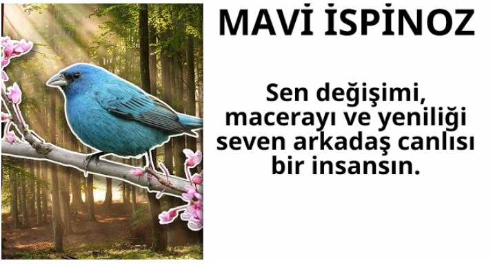 ŞUBAT Senin doğum kuşun “maviispinoz” Sen değişimi, macerayı ve yeniliği seven arkadaş canlısı bir insansın. Tamamen eşitliğin ve kardeşliğin hakim olduğu bir dünyanın özlemi ile yaşıyorsun. Senin için her şeyden önce ideallerin gelir, aşk ikinci plandadır. Çok güçlü sezgilere sahipsin fakat bazen duyguların sezgilerinin önüne geçebilir. Özgürlük senin asla vazgeçemeyeceğin bir şey ve hayatın anlamıdır. Seni diğer insanlardan ayıran en önemli özelliğin bağımsızlığına çok düşkün olman. Şimdi sonucunu arkadaşlarınla paylaş!